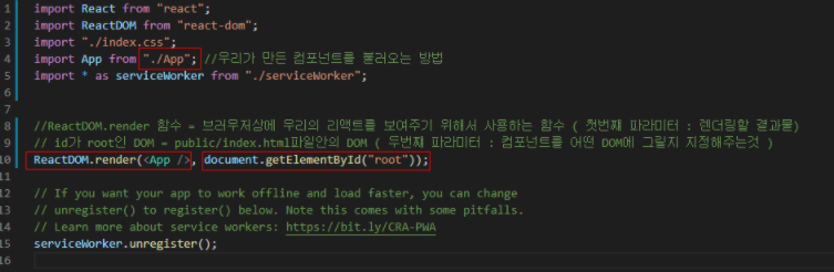 불러와야 사용할 수 있습니다. → import App from "./App";