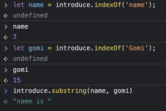 2) substring 결과 'is '인 이유? gomi의 앞 인덱스 까지 출력하기때문에 공백도 출력됩니다.
